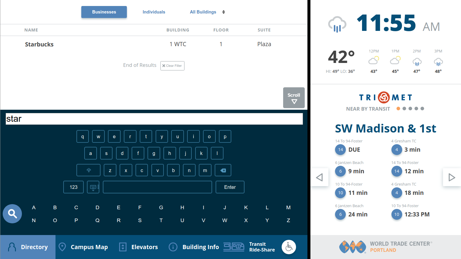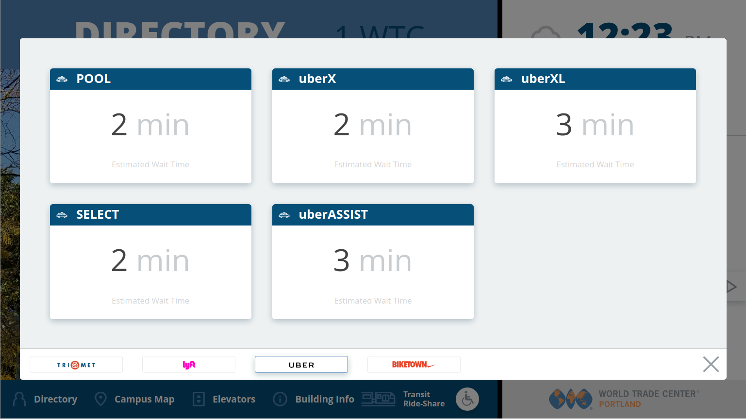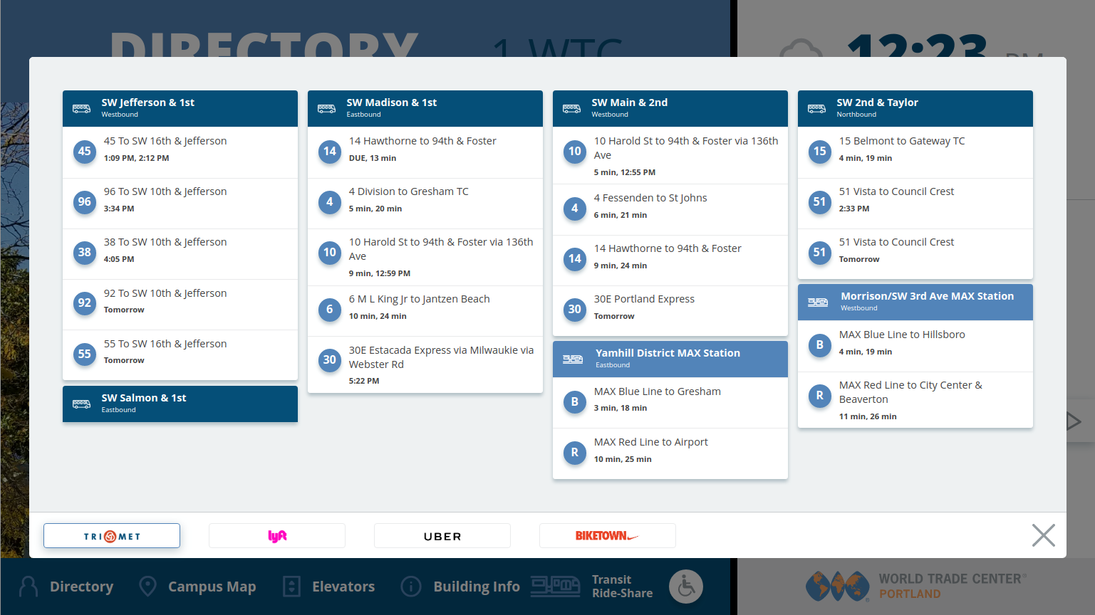 In the fall of 2017, the customer requested a more comprehensive display tracking alternate transportation options beyond the TriMet sidebar in the initial design. The transportation options overlay provides detailed data for TriMet bus and commuter train service, Uber and Lyft ride-sharing, and Social Bikes automated bicycle rentals. The back-end component collates the most recent data from the remote servers locally, so the cached data loads without delays.