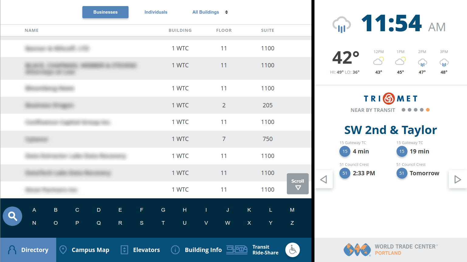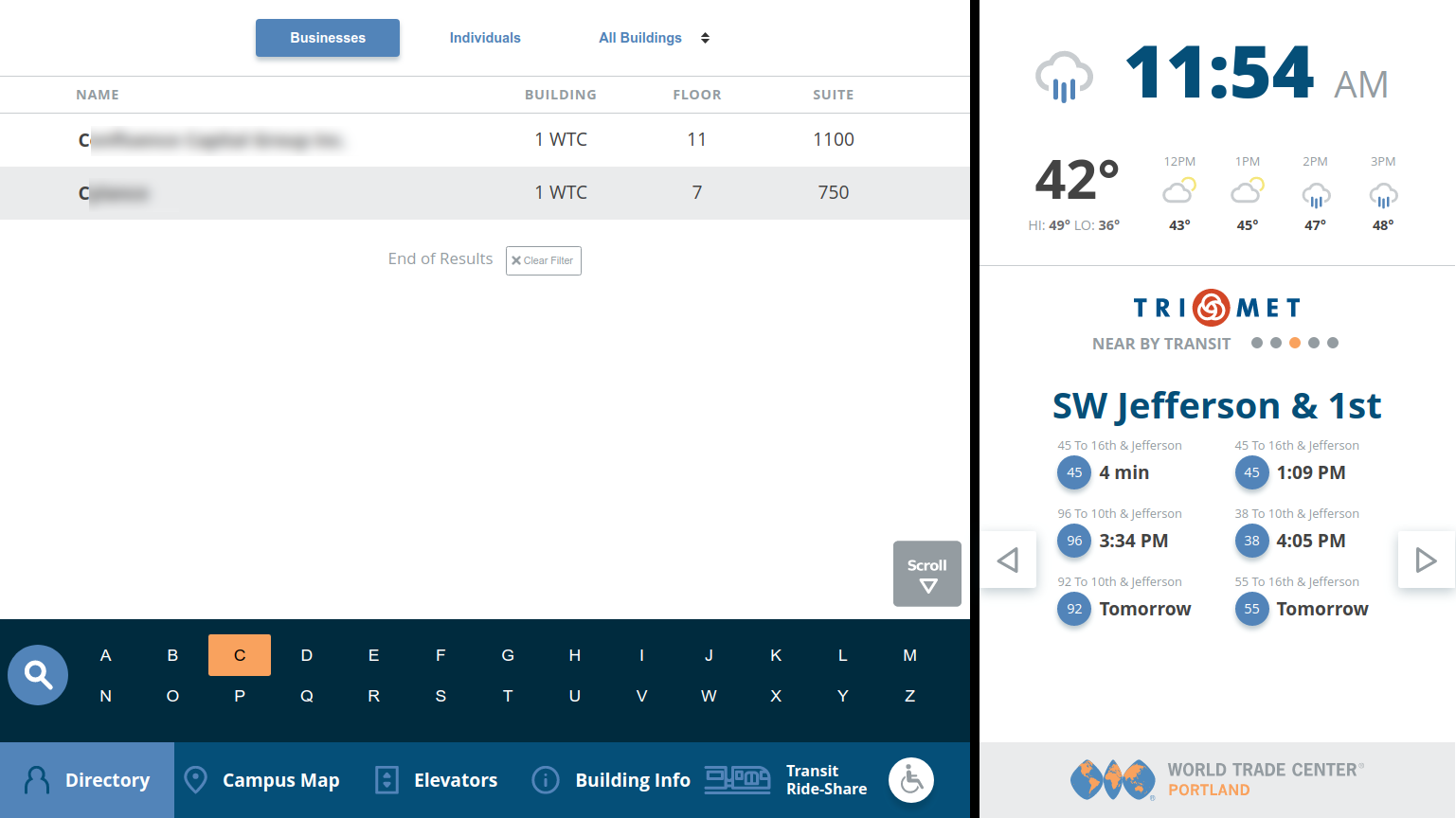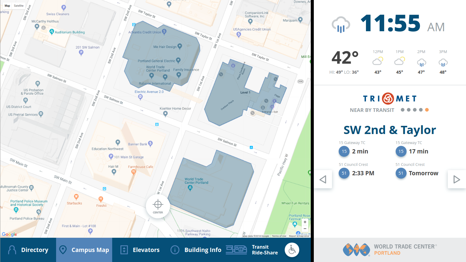 In the fall of 2017, the customer requested a more comprehensive display tracking alternate transportation options beyond the TriMet sidebar in the initial design. The transportation options overlay provides detailed data for TriMet bus and commuter train service, Uber and Lyft ride-sharing, and Social Bikes automated bicycle rentals. The back-end component collates the most recent data from the remote servers locally, so the cached data loads without delays.