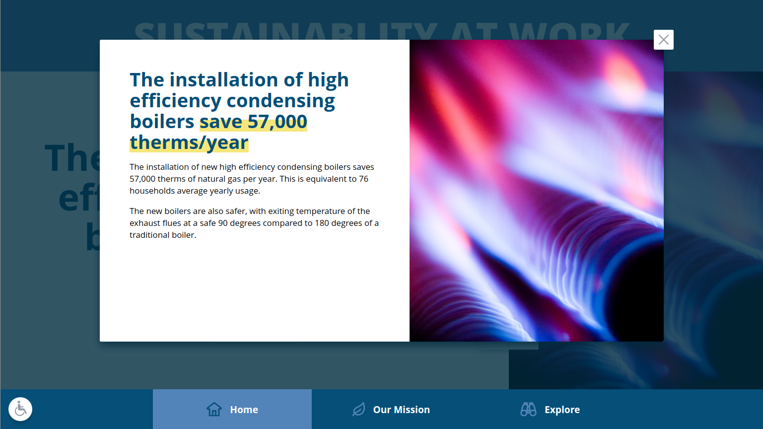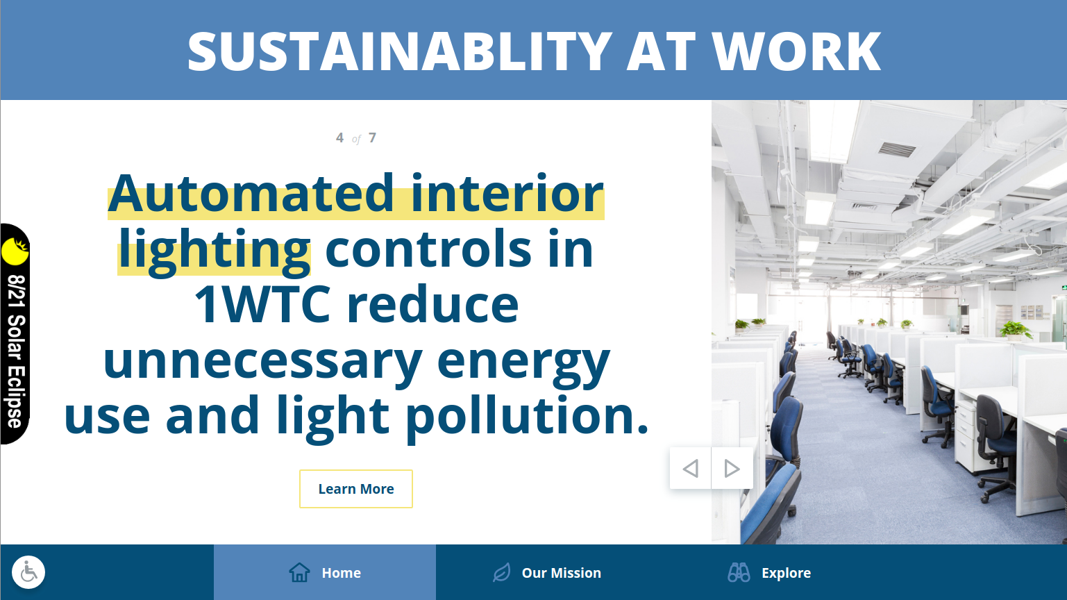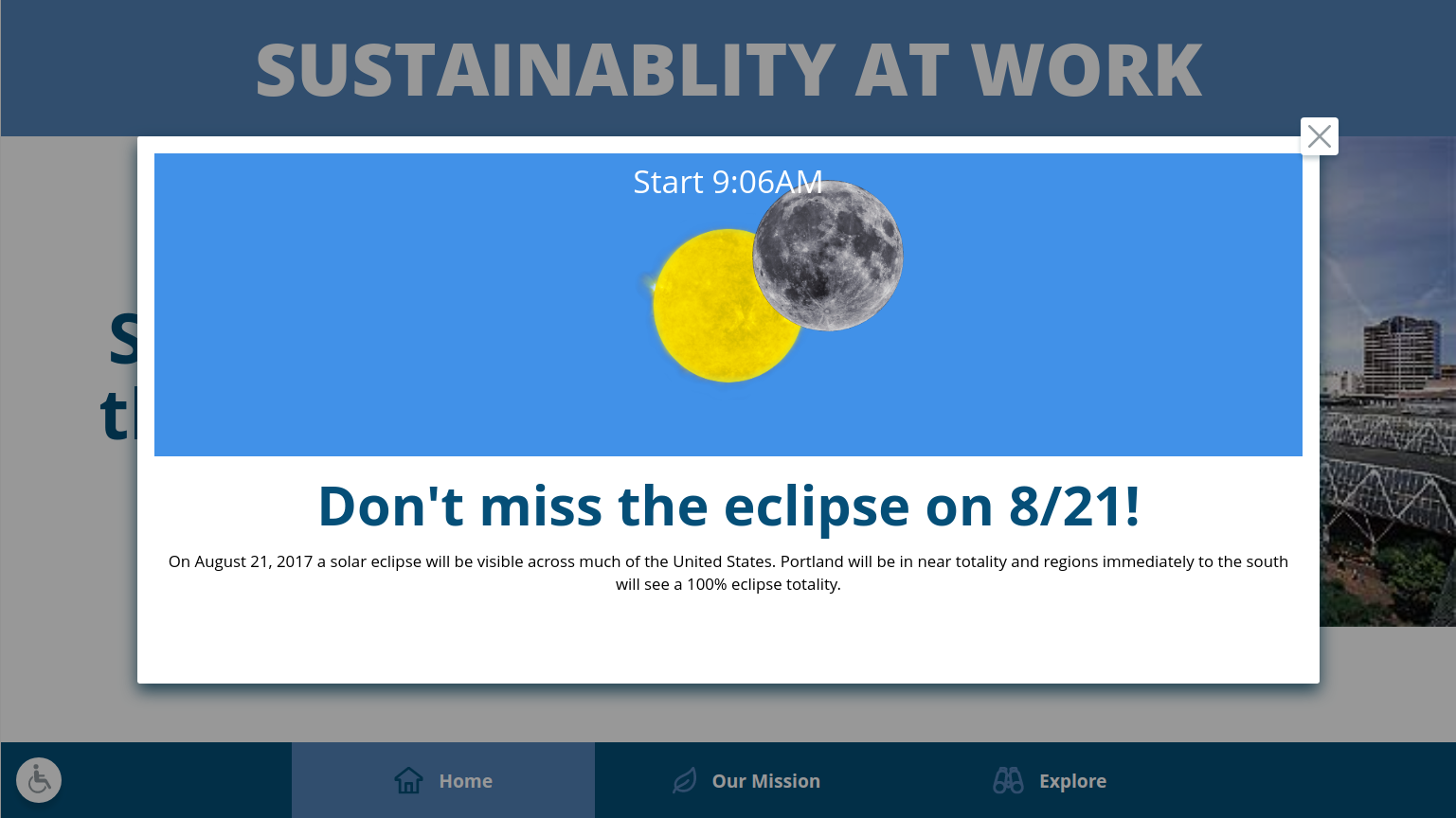 In the summer of 2017, a very rare solar eclipse was visible across much of the United States. WTC management wanted something to highlight special events of interest. I created an overlay component that displays specified content over the standard Kiosk display between specified dates and times. The overlay is tied into the idle timeout to be showing when there is no interaction with the displays. The overlay content can be entered like any other page or load remote content in an iframe, for example, the embeddable video stream from NASA TV.