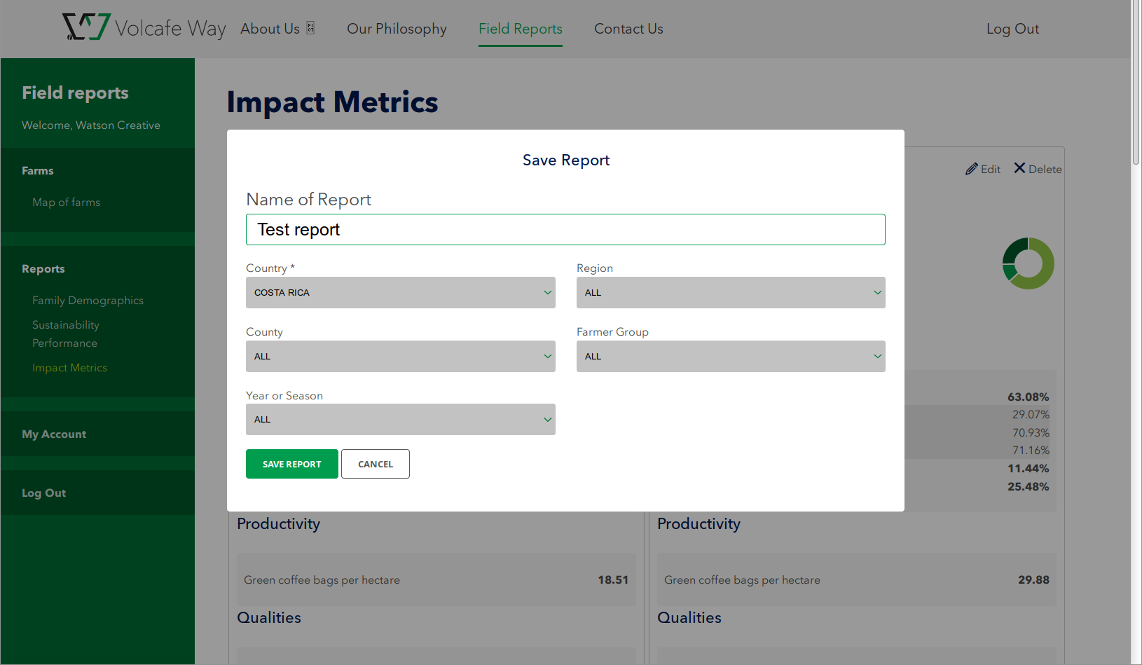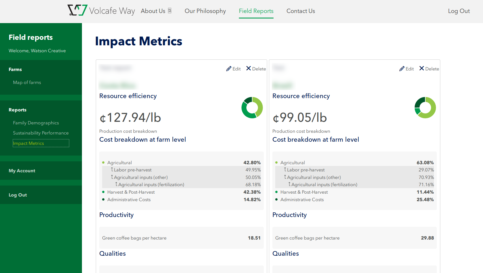 Reporting application for exploring demographic, environmental, and financial metrics about coffee growers around the world. Project primary is the Watson Creative agency, providing design and specifications.