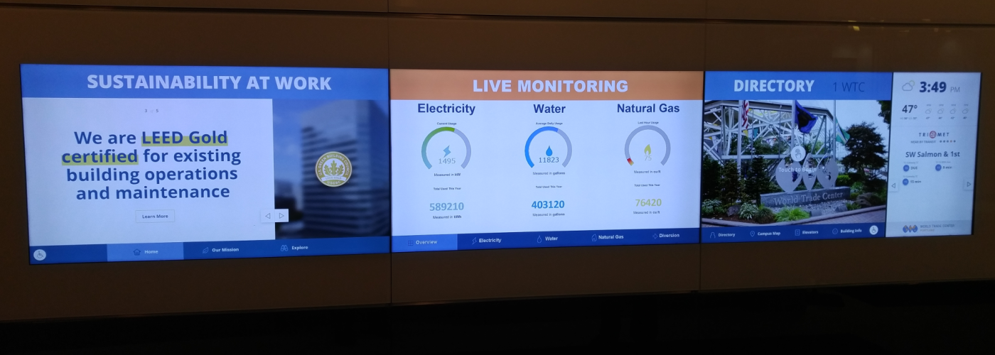Interactive tenant directory featured articles and additional helpful information available on multiple screens built in touch display array.
