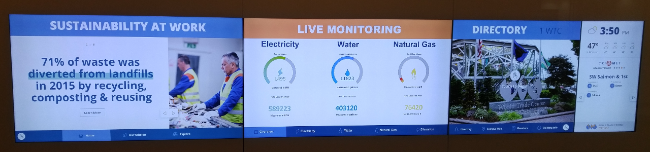 The displays are hosted in a built-in installation in the lobby of WTC Portland Building One. A plate-glass panel is the structures external surface, and the screens are about ¼ inch behind the glass. The glass has an inductive touch sensor film applied to the back surface to allow public interaction with the displays. The touch film technology is from Touchfoil.